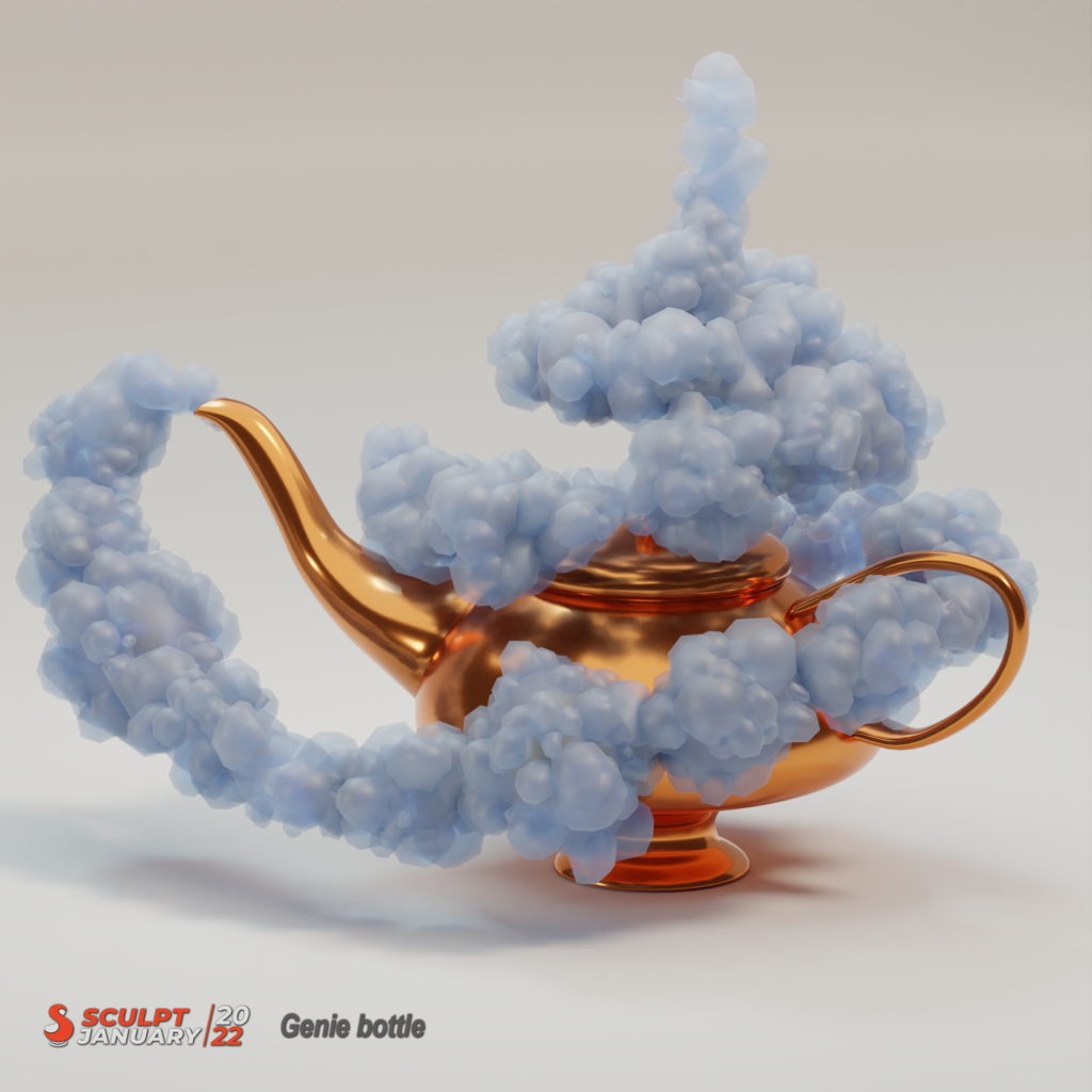 Nouveau thème, nouvelle image pas vraiment en sculpture mais plus en modélisation. J’aurai voulu faire un rendu plus vaporeux pour le « nuage » sortant de la lampe du génie, mais je ne sais pas faire et la solution proposée par la rapide recherche que j’ai googlelé m’a semblé bien compliqué à mettre en oeuvre par rapport au temps donc je disposais.