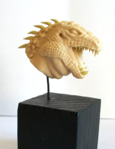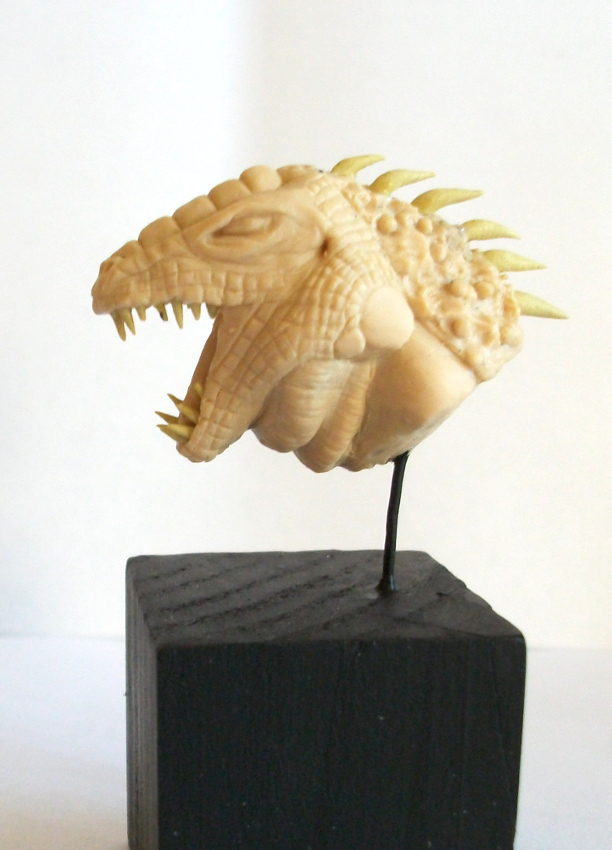 Les écailles n’ont pas été ajoutées, mais gravée dans la pâte fraiche pour la plupart. Les dents sont en milliput et ont été simplement enfoncées dans la mâchoire encore fraiche avant la cuisson.