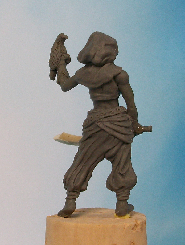 Fimo sur green stuff sur fil de fer pour la figurine, milliput sur fil de fer pour l’épée. 30mm environ.